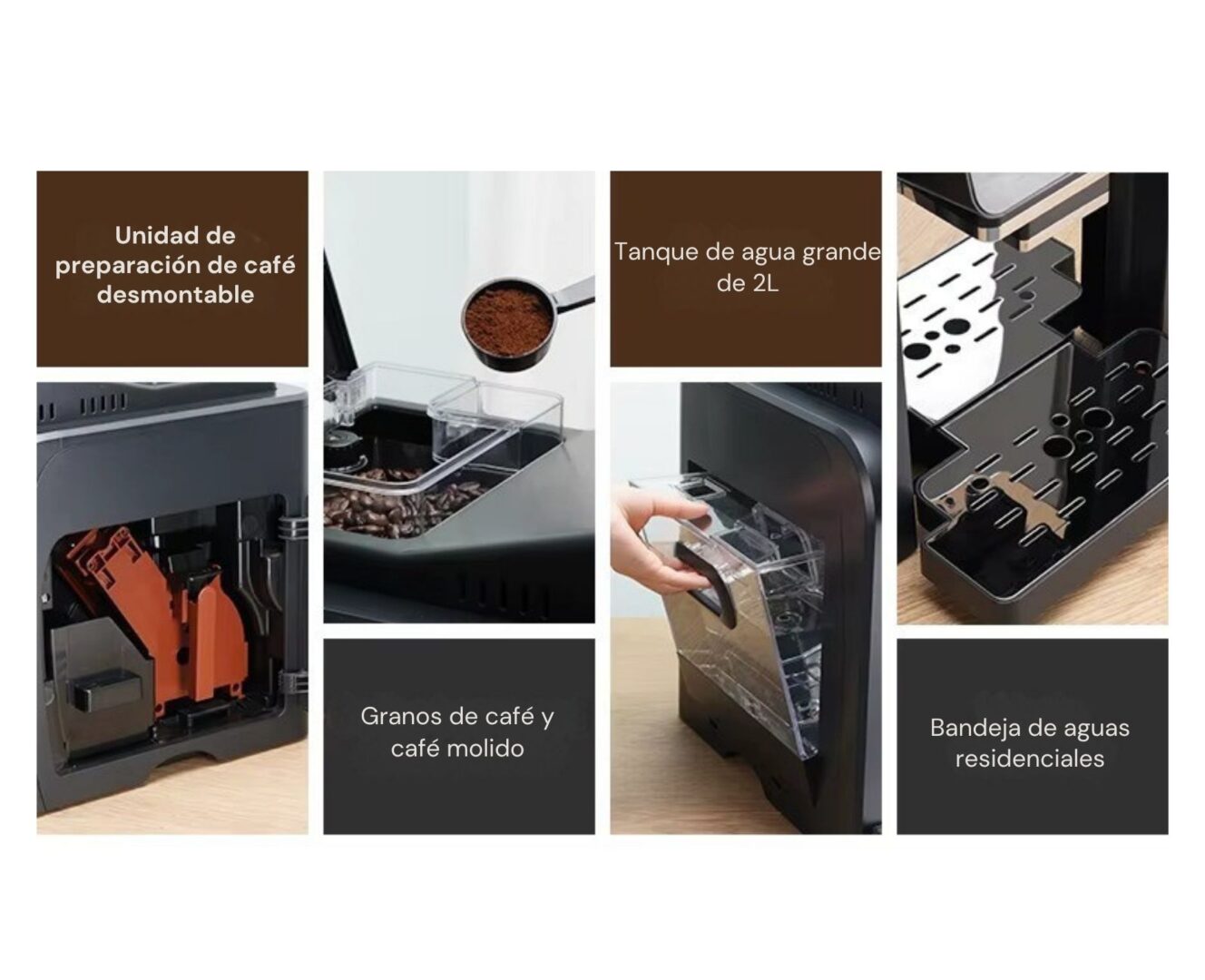 Eficiencia Profesional: Depósito de agua de 2L y cajón de residuos para 15 servicios, minimizando el mantenimiento diario.