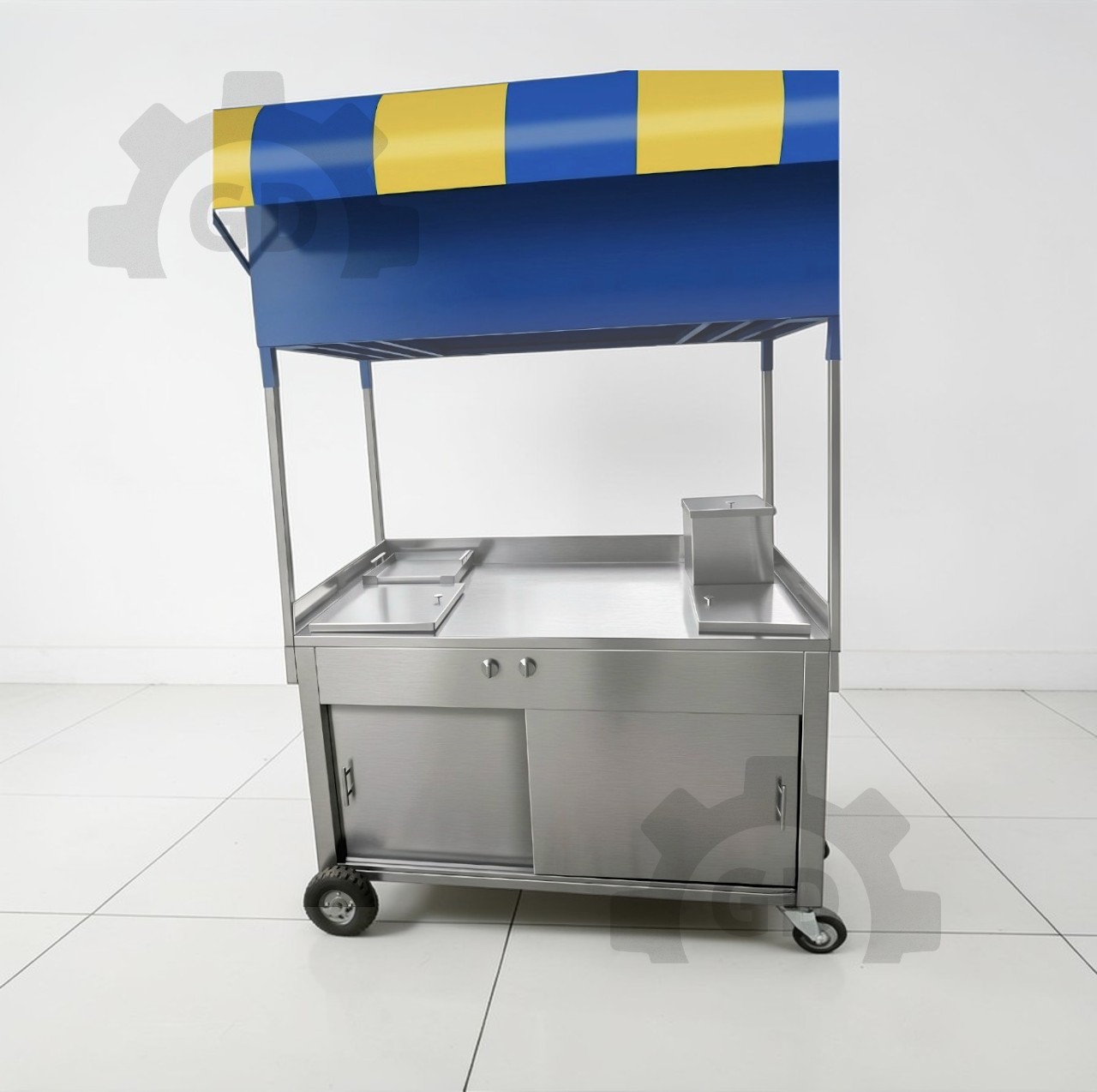 Carrito para chorys diseñado para ofrecer comodidad y eficiencia durante la preparación. Este modelo destaca por su diseño con espacio central libre, permitiendo al operador trabajar de forma más cómoda, ordenada y con mejor acceso a los ingredientes.