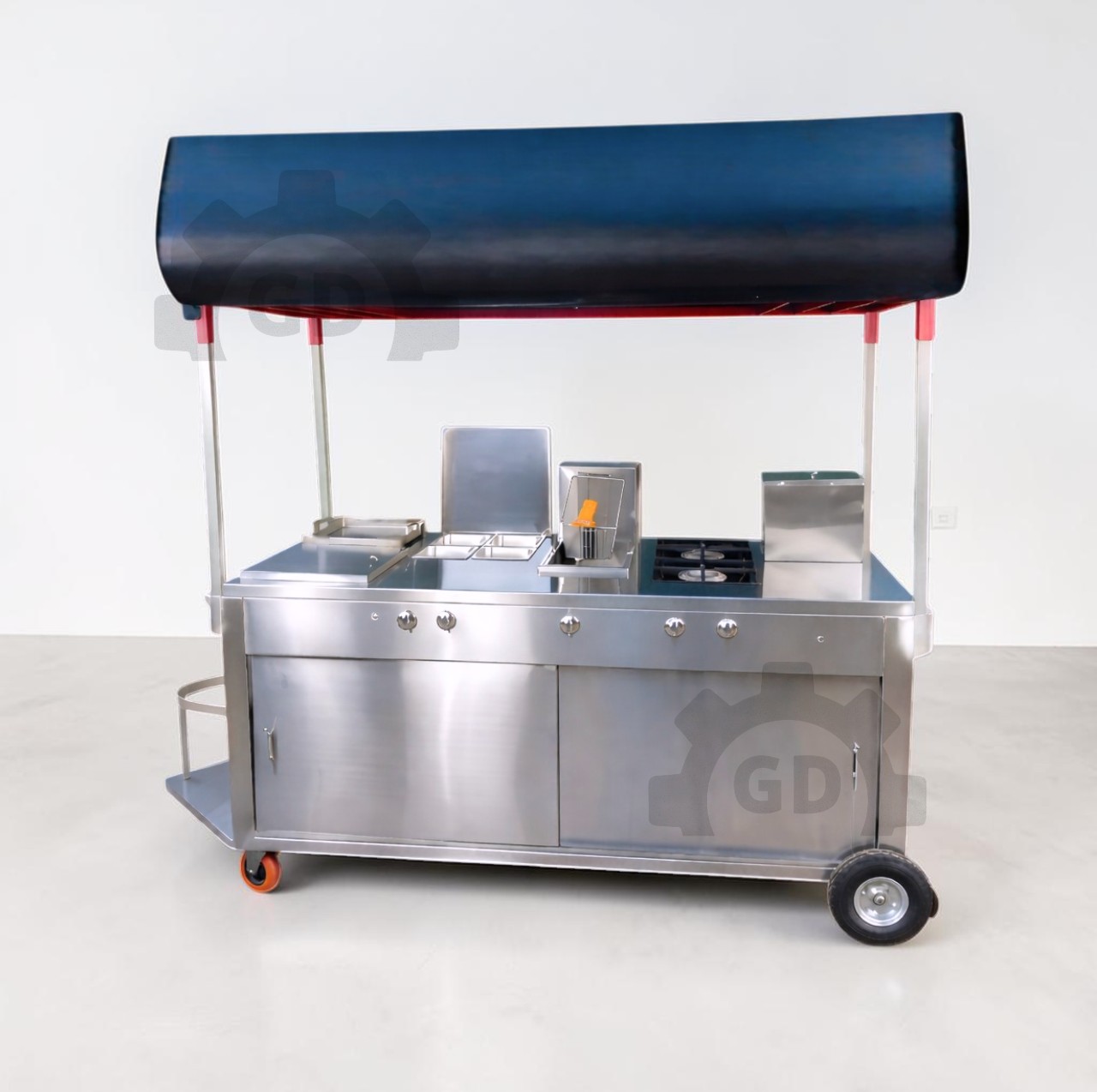 Carrito multifuncional diseñado para negocios que buscan máxima versatilidad en un solo equipo. Este modelo permite preparar distintos tipos de alimentos al mismo tiempo gracias a sus múltiples áreas de cocción, convirtiéndolo en una solución completa para cocina móvil.