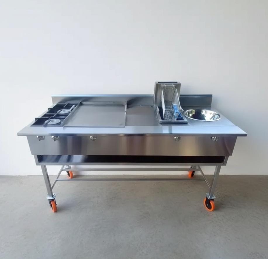 Cocina industrial multifuncional, dos quemadores, comal y freidora normal, freidora huacal y área de trabajo.