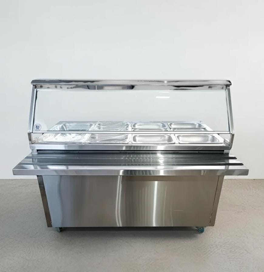 Mesa térmica 4 módulos, vidrio recto y elaborada en acero inoxidable.